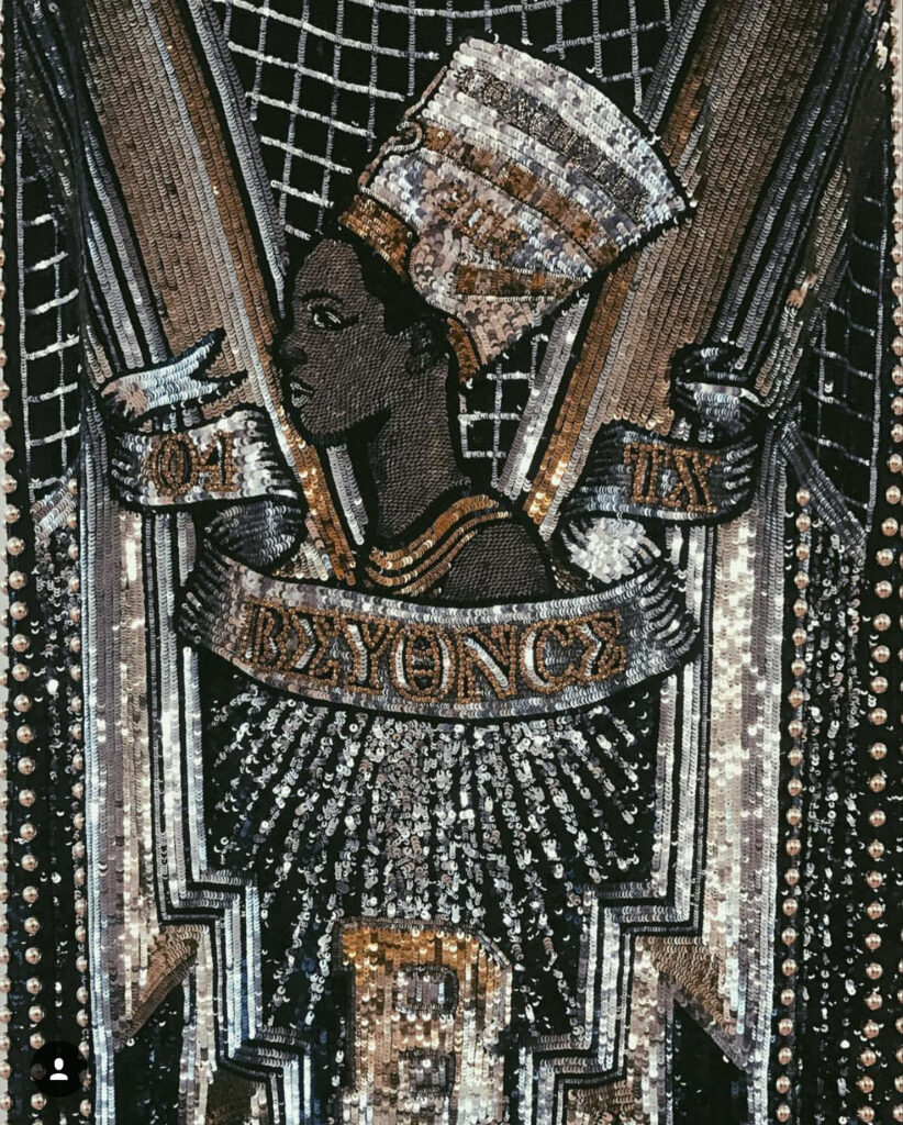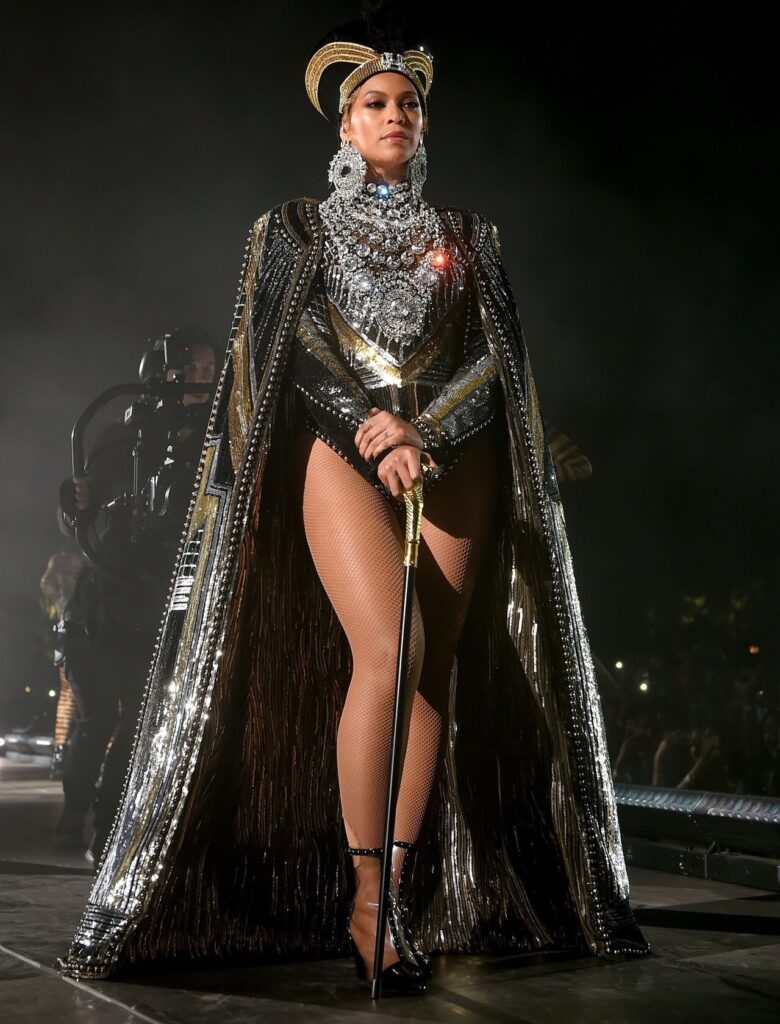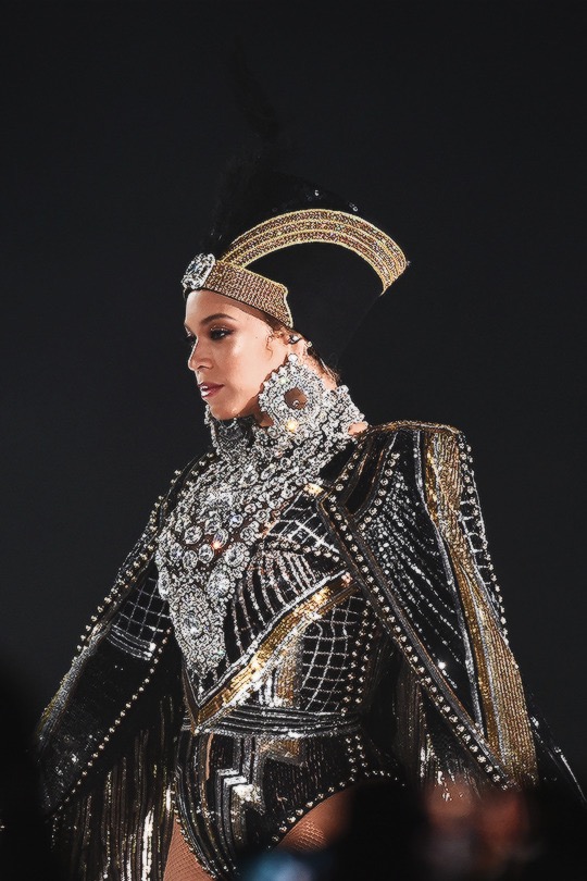 Beyoncé entered the stage paying homage to the Queen Nefertiti dressed in a head-to-toe attire inspired by ancient Egypt and continued on that same wavelength for the entire show. All of her looks were created and designed by Olivier Rousteing for Balmain; in each looks moment she showed love to historical artist and figures like Malcom X, singing the National Black Anthem, "Lift Every Voice and Sing" by James Weldon Johnson and Nina Simone. Not to mention her numerous samples iconic hip-hop and music artist in homage from The Jackson 5, to Outkast, Master P. to even the 1970's Berry Gordy classic The Wiz.