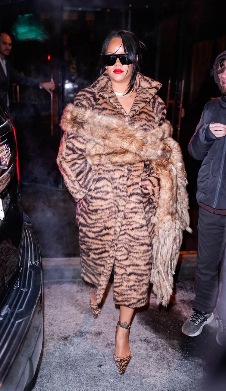 Rihanna, as always, makes it look effortless. She’s wrapped in a form-fitting wool-blended jacquard coat by Alaïa in a bold tiger print, paired with stiletto calf-hair ankle-strap pumps from the French fashion house, a look that manages to be both fierce and elegantly restrained. Its animalistic monochrome that provides a little bite, perfect for a late-night city rendezvous.